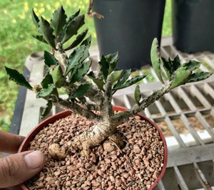 Miniature caudiciform that has silver grey branches with green curly leaves and pink flowers.